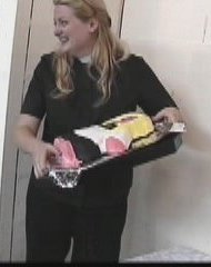 Rachel at her post-ordination party, preparing to baptise her first cake.